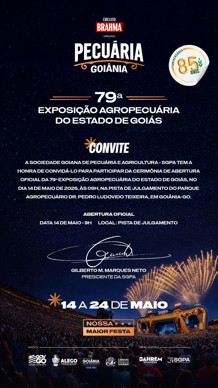 A Sociedade Goiana de Pecuária e Agricultura – SGPA tem a honra de convidá-lo para participar da Cerimônia de Abertura Oficial da 79 ª Exposição Agropecuária do Estado de Goiás, no dia 14 de maio de 2026 as 09:00h na pista de julgamento do Parque Agropecuário Dr. Pedro Ludovico Teixeira em Goiânia Goiás